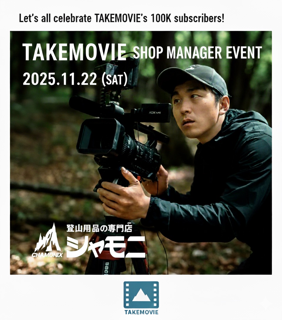 当日は10:00〜19:00まで店でお仕事していますので、一緒に写真を撮るもヨシ📷なかなか聞けない質問をしてみるもヨシ🧐接客して貰ってお買い物するもヨシ🎁滅多にない貴重な機会、是非お越し下さい🙇‍♂️また、YouTube動画内でTAKEMOVIEさんが使用しているクライミングギアやポーターレッジを店舗にて特別に展示させて頂きますので、そちらも是非見に来て下さい‼️