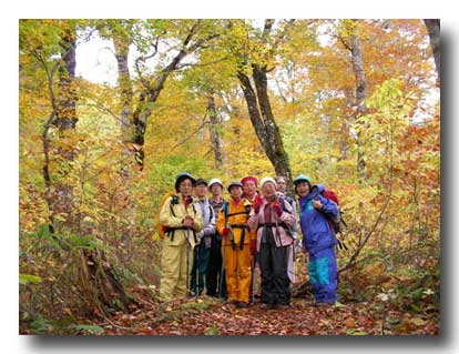 紅葉が真っ盛りのブナ林で記念撮影、色とりどりの雨具が綺麗