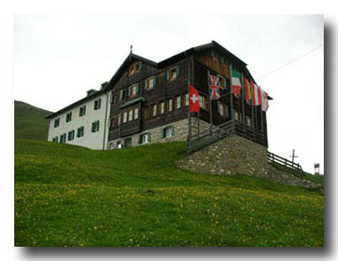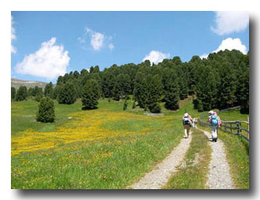 08.6月24、25日ドロミテ最後のハイキングは山小屋シュルラーハットに一泊してガイスラー山群の裾野を歩きました。24日の朝、4泊お世話になったホテルEdithを出発、山小屋までは2時間ぐらいなので午前中は近くの町BOZEN(ボルッツアーノ)まで観光と昼食に立ち寄りました。昼食を終え一路登山口へ、天候は曇り空に変わり登り始めると雨になりました。今回初めて雨具を着ましたが山小屋に着くころには雨も止み晴れてきました。翌25日は快晴、気持ちよくガイスラー山群を歩きサンモリッツの途につきました。