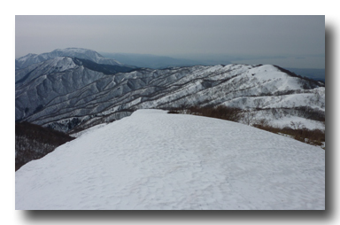 先日の雨でたっぷり水分を含んだ雪面は氷の斜面になっていました。奥伊吹スキー場からの山