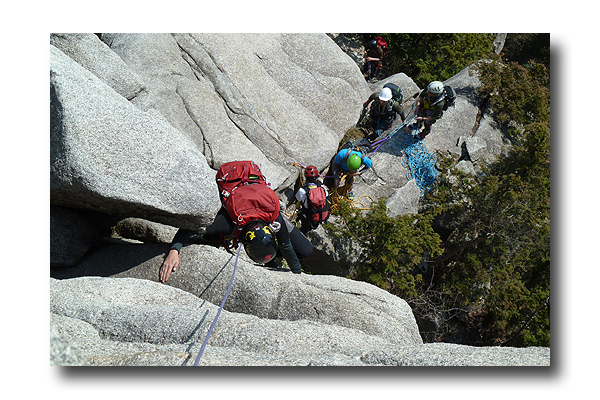 ********* 前尾根中間部、P4下部のフェースを登る先輩 ***********
