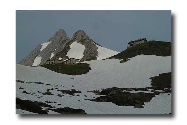 **** 初日の宿泊先、ボンノム小屋2400mに到着 残雪のおかげで早く到着 *****